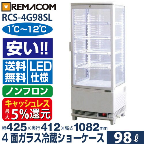 【 1年保証 送料無料 】 新品 レマコム 4面ガラス 冷蔵ショーケース 98L 5段(中棚4段) RCS-4G98SL 業務用 LED 冷蔵庫 タテ型 ノンフロン ディスプレイ 冷蔵庫 +1〜+12℃ 片面扉 曲面ガラス カギ付