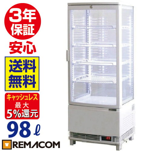 【3年保証 送料無料 】 レマコム 4面ガラス冷蔵ショーケース 98L 5段(中棚4段) RCS-4G98SL 業務用 LED 冷蔵庫 タテ型 ノンフロン ディスプレイ 冷蔵庫 +1〜+12℃ 片面扉 曲面ガラス カギ付
